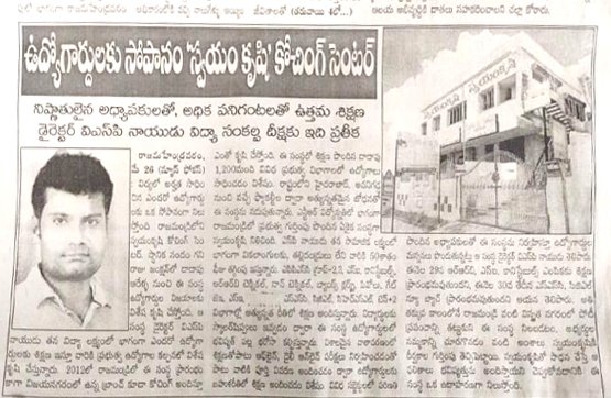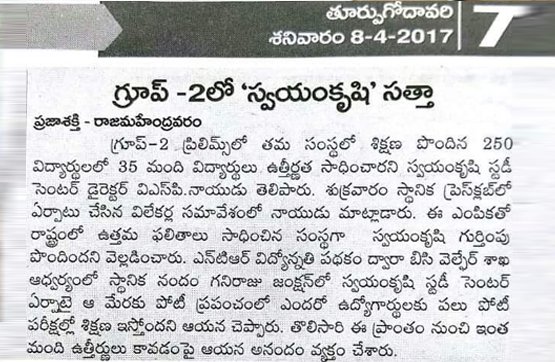Swayam krushi Study centre, with the motto to prove the "Power of Hard work "Started in 2012, Feb. The Institute was started by Sri Dr. VSP Naidu, M.sc, the Director. This is the best place to achieve the Success. The Institution provides an atmosphere to boost up your skills, attributes and qualities in achieving your goals. We provide you with reliable Education courses, Softskills and other skills needed to be developed in an Aspirant .We provide you the quality Education with proven Experience.